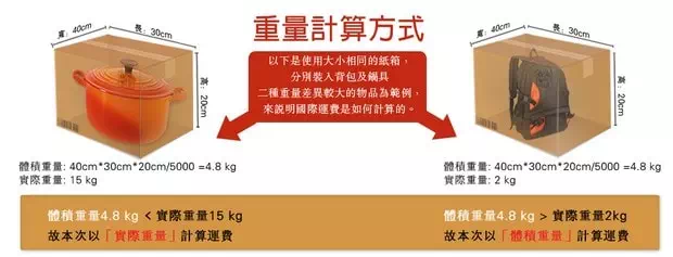 「實體重量」就是貨物連包裝物在內的真正重量,以公斤(kg)為單位,但會以0.5kg為一個單位起跳,例如一件重量是2.1kg的貨物,它的「實體重量」會進位為2.5kg。而「體積重量」就是根據貨物包裝物的長、寬、高三邊的長度(以厘米cm為單位)的乘積再除以5,000計算轉化為公斤(kg)單位,計算公式是:[長(cm)X寬(cm)X高(cm)]/5,000,但同樣會以0.5kg為一個單位進位。例如一件長、寬、高分別是20cm、15cm和10cm的貨物,它的「體積重量」就是1kg,即是(20X15X10)/5,000=0.6(kg),進位後是1kg。